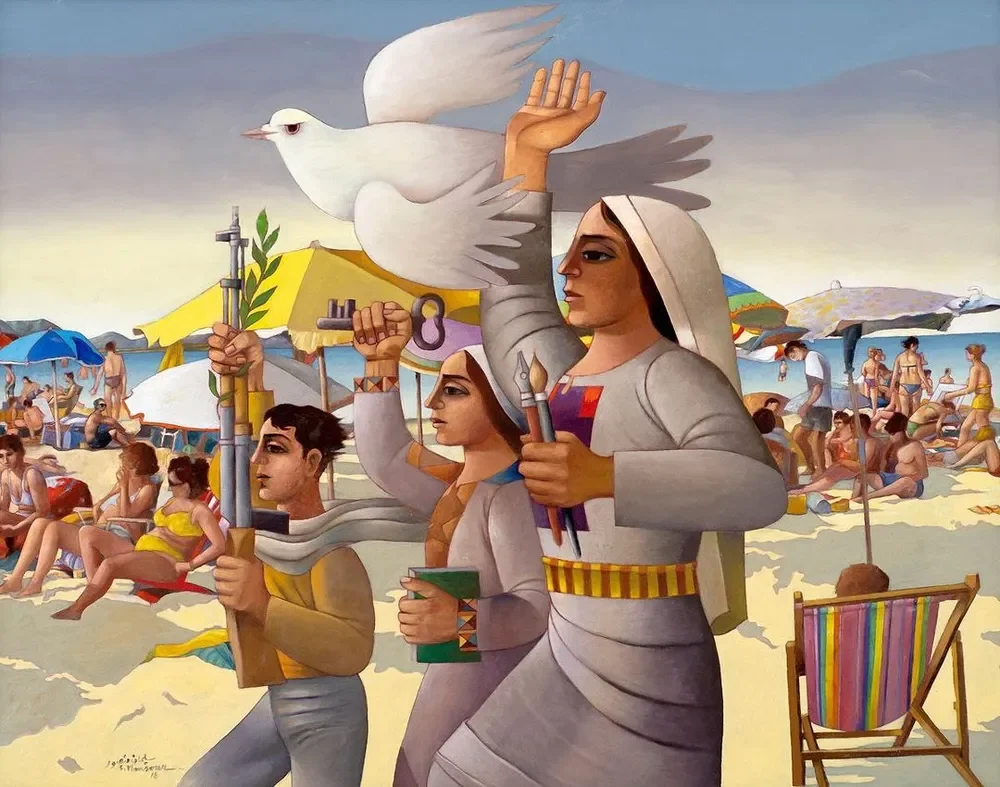 During the Nakba, many families kept the keys to their original homes they were forced to leave to symbolize that they would return. As such, the key became a prominent symbol for the Palestinian refugees as they waited for the day they were given the right to return home. Sometimes, a key is not the only symbol held in the hands of a figure in a work of art. Often, a key is in the hand to signify the waiting to return, while the rosary is held to mean the failing hope and a cigarette represents the distracted or lost refugee who has all but given up.